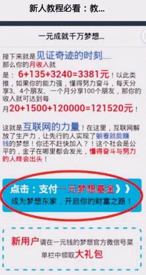 “一次性低投入,终身可享高回报”,对于这种拙劣的骗术,大部分人是不予理睬嗤之以鼻的。可是,如果投入只有1元钱呢,您会考虑尝试一下吗?目前,一个名为“一元创富”的项目在微信朋友圈转载,该创业项目宣称“投入1元钱,即可终身月收入3000元”。因为投入资金只有区区的1元钱,许多人放松了警惕。